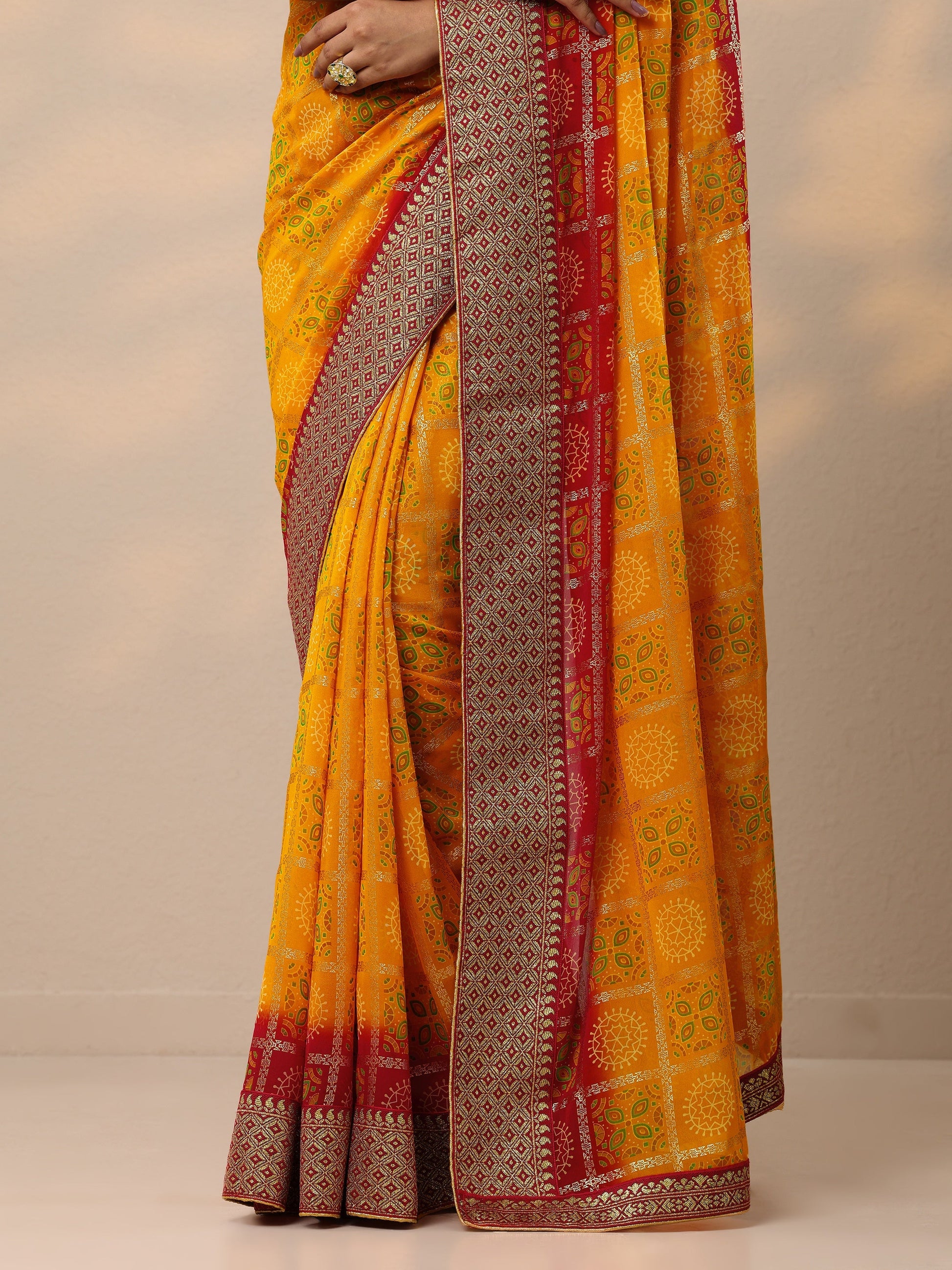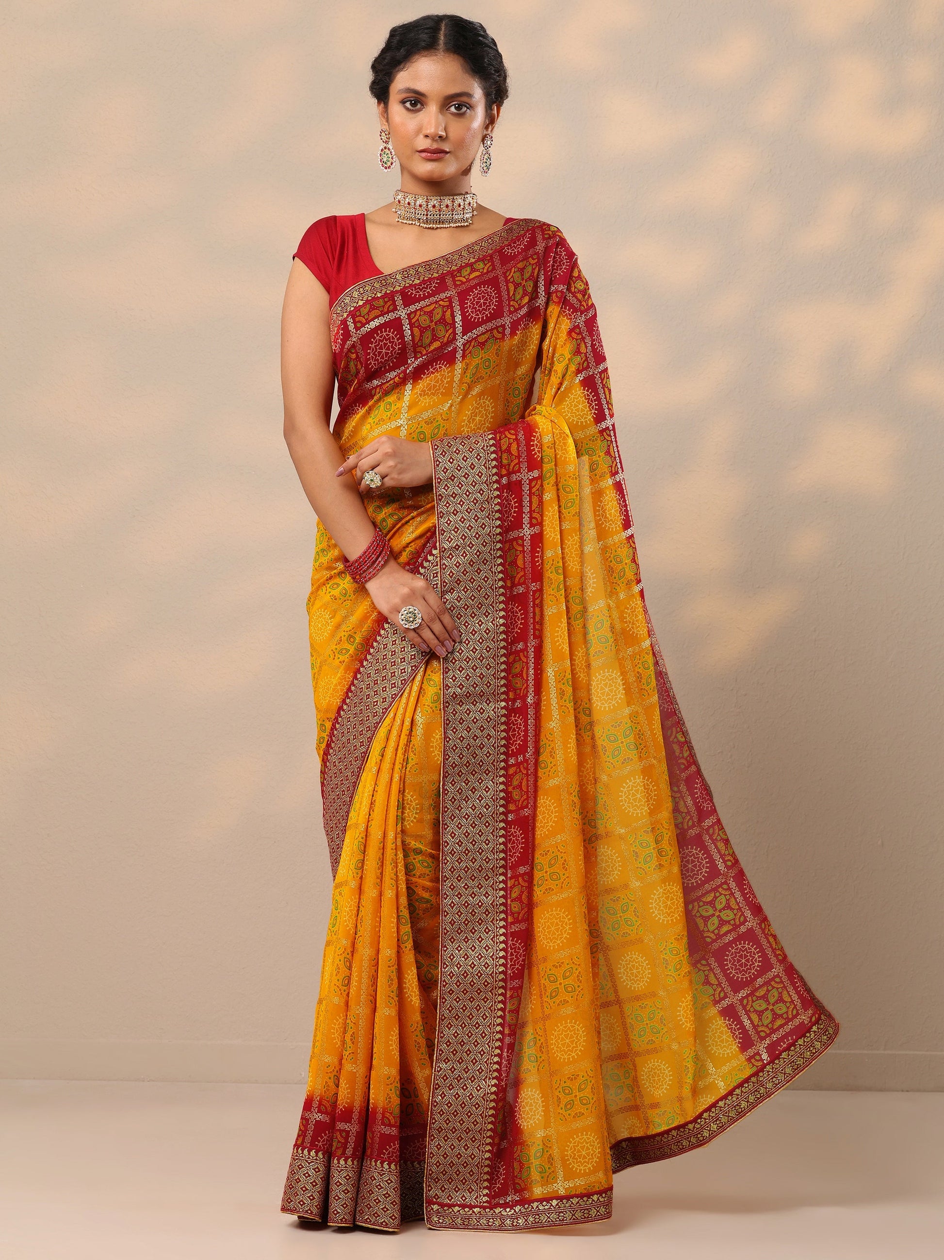 Yellow Bandhani Printed Georgette Saree With Unstitched Blouse Piece