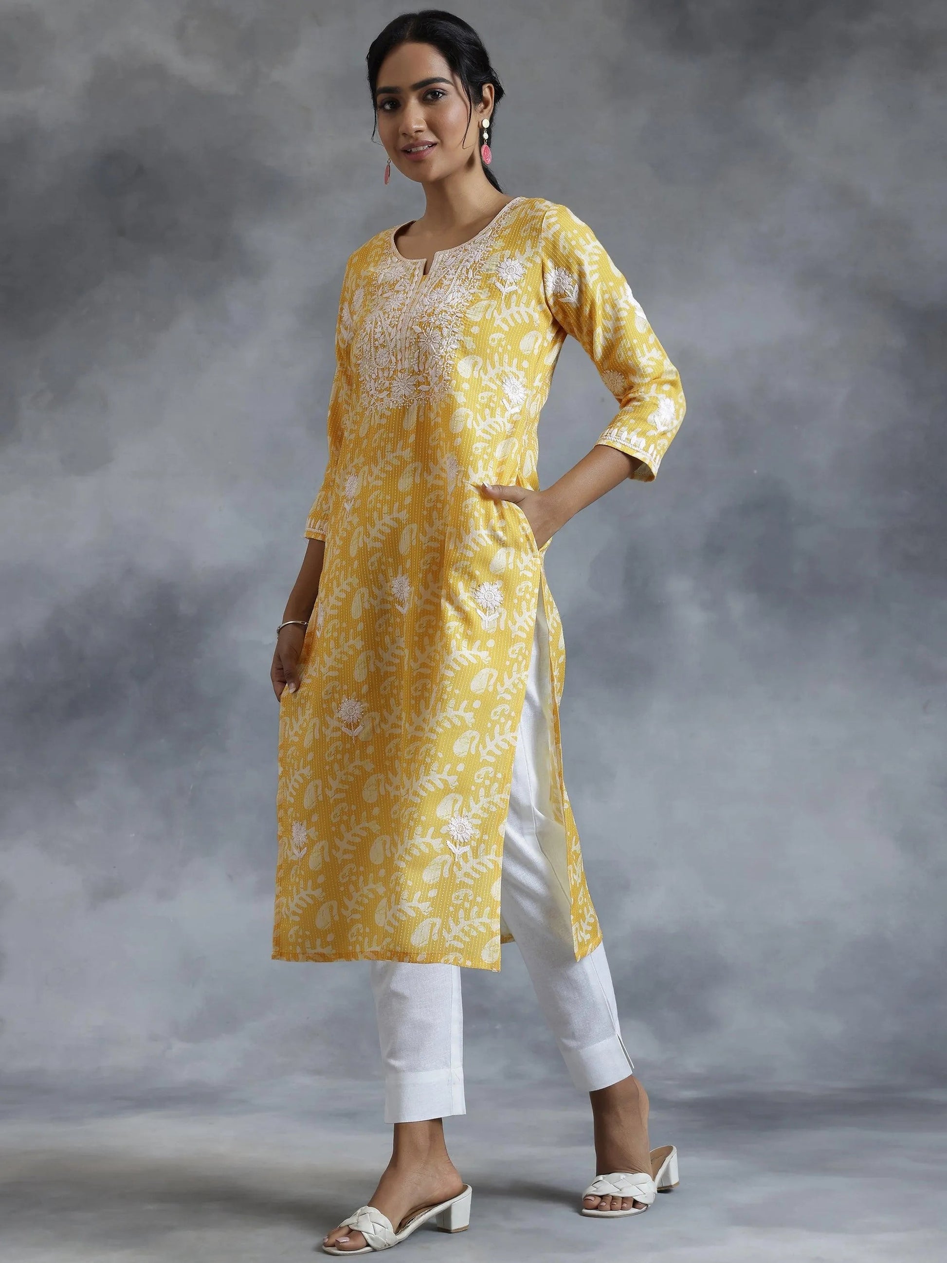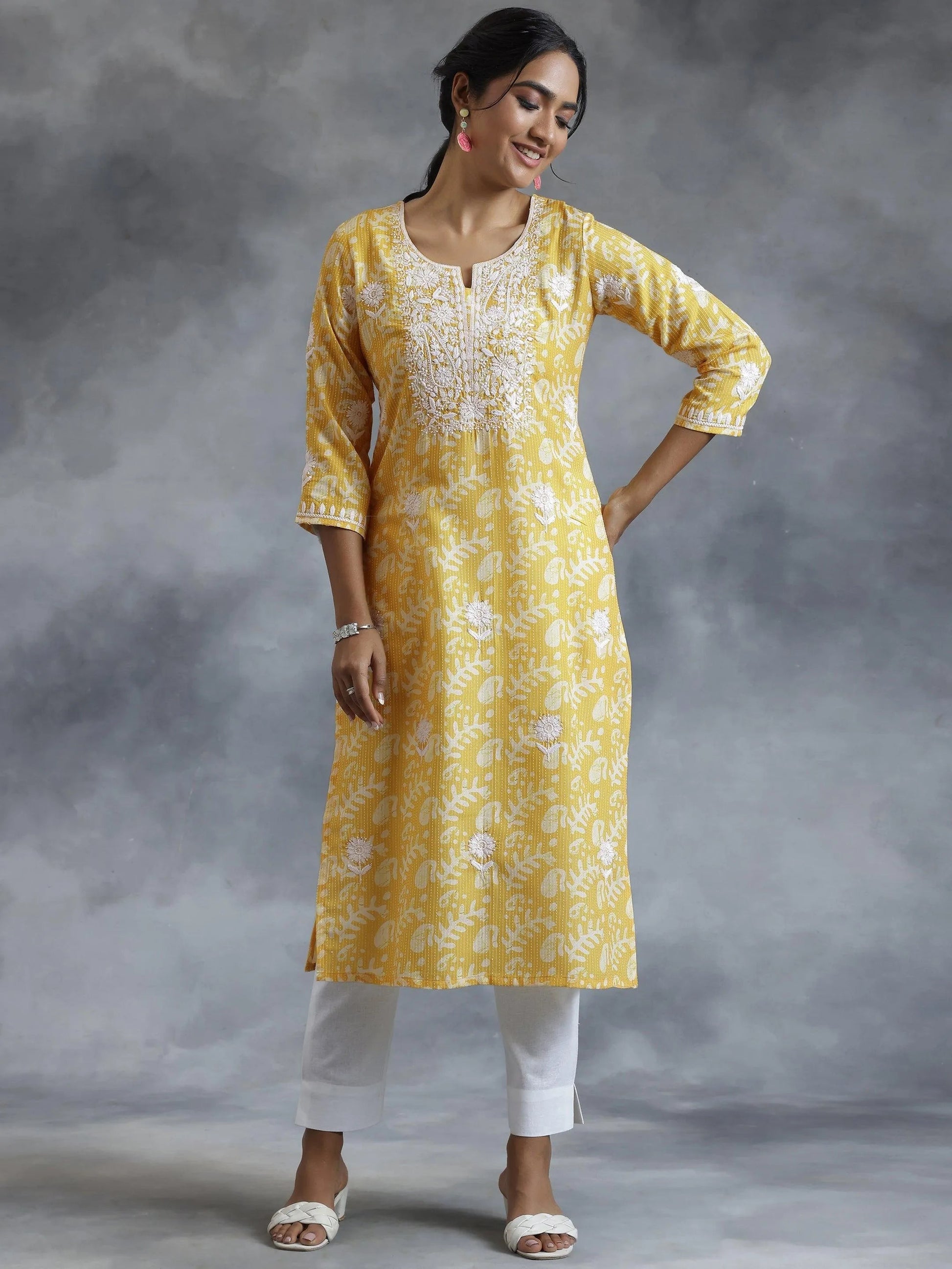 Yellow Embroidered Cotton Straight Kurta