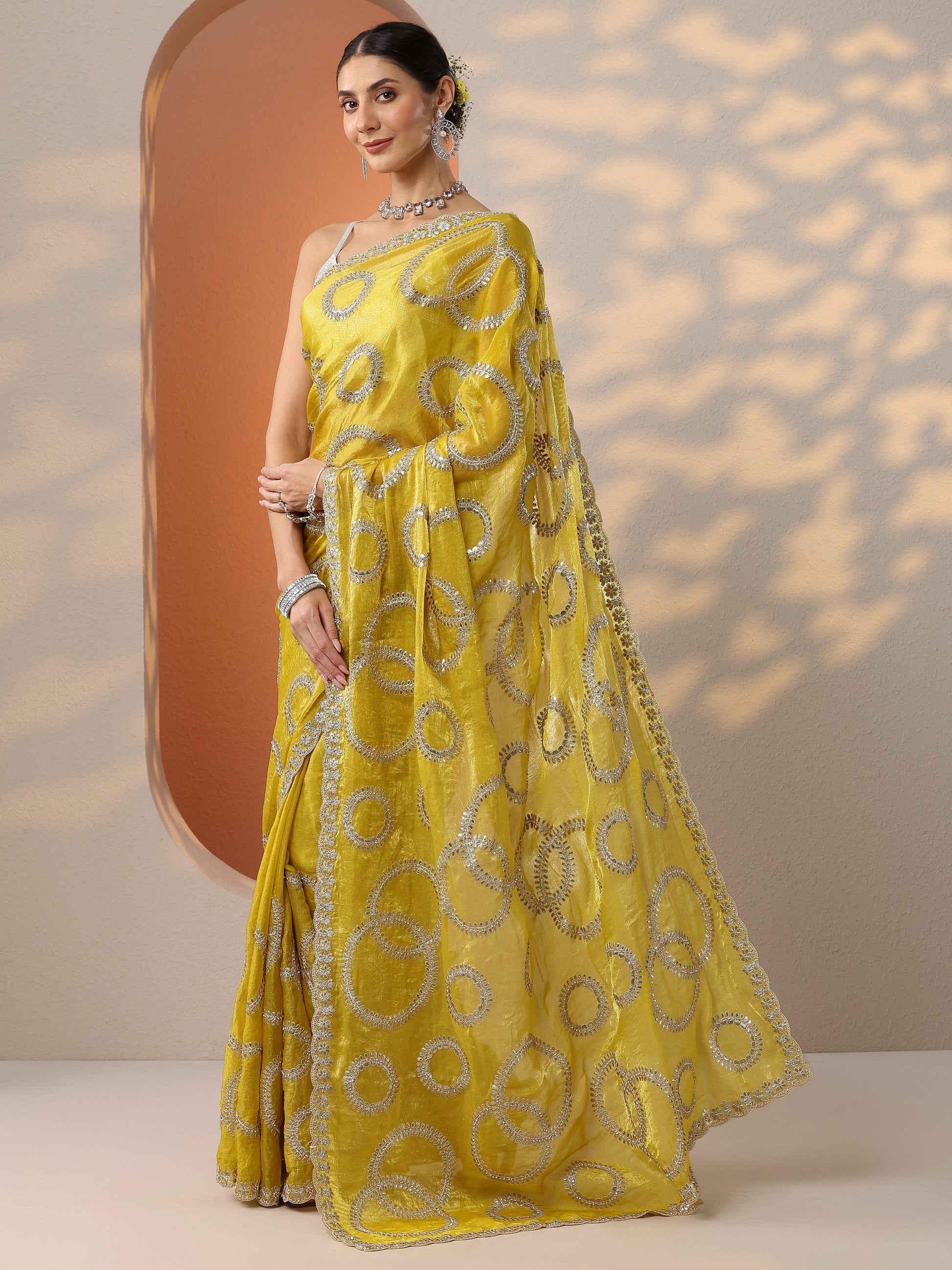 Yellow Embroidered Organza Saree With Unstitched Blouse Piece