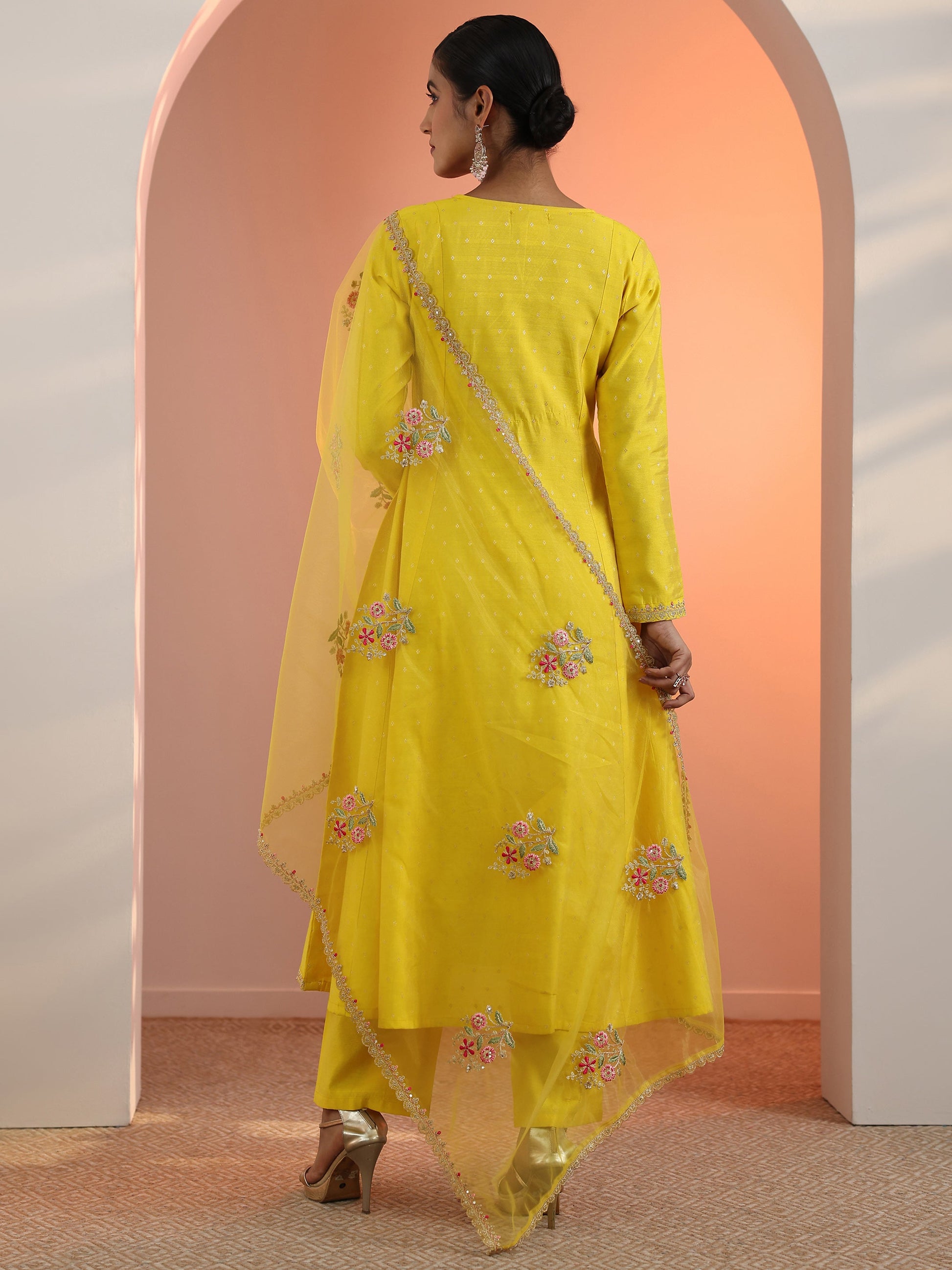Yellow Embroidered Silk Blend A-Line Suit Set With Dupatta