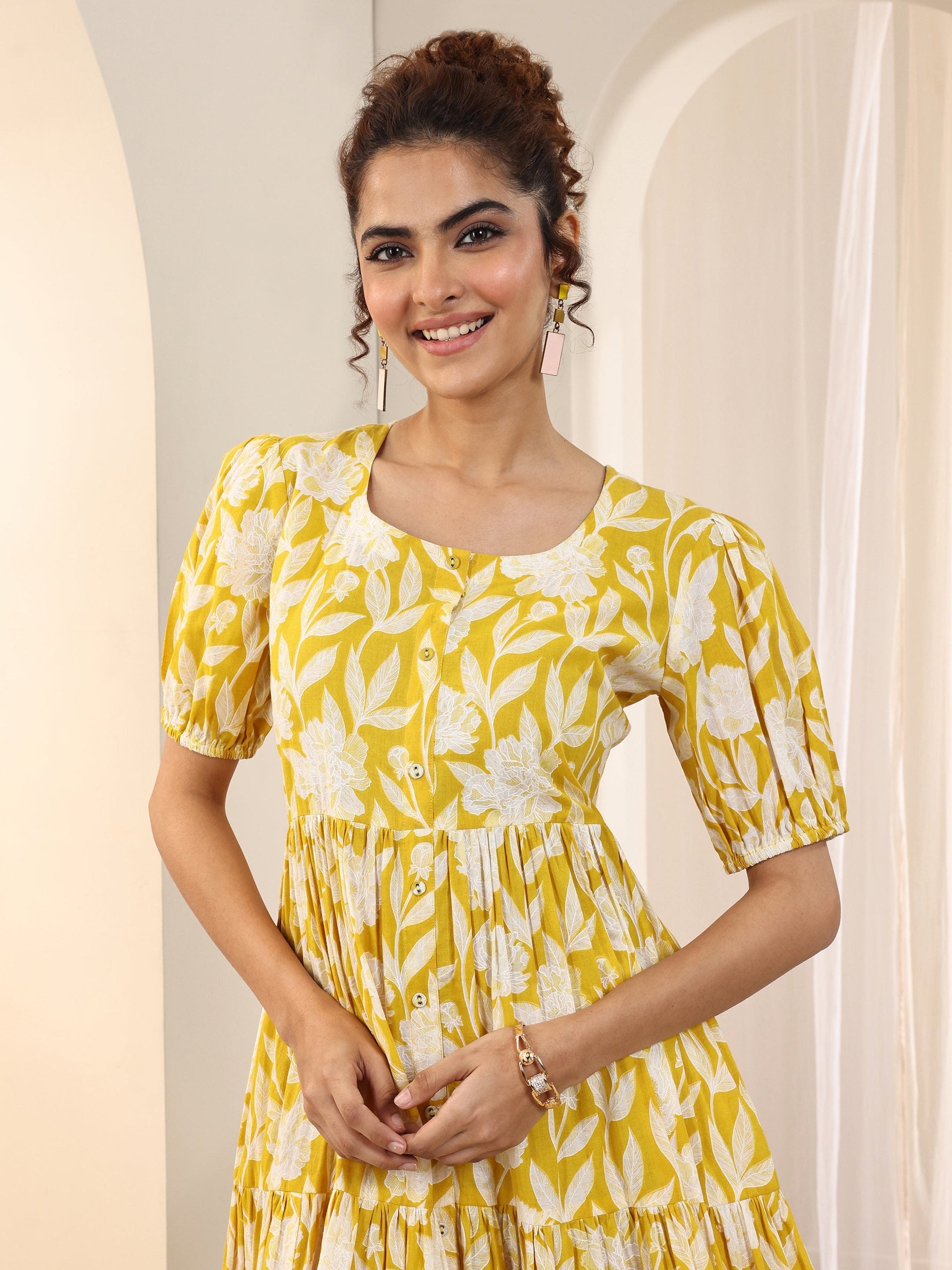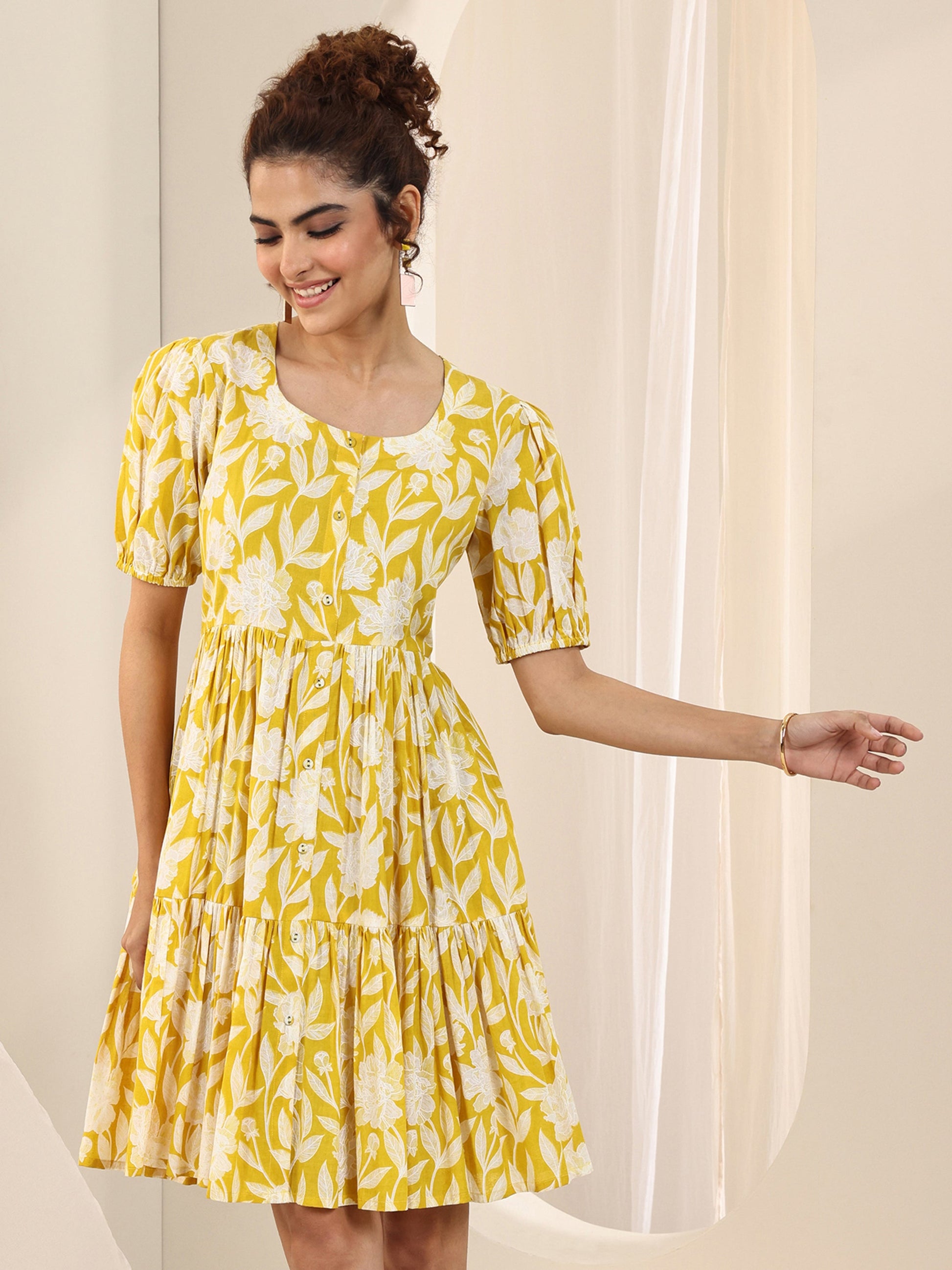 Yellow Printed Cotton Fit and Flare One Piece Dress