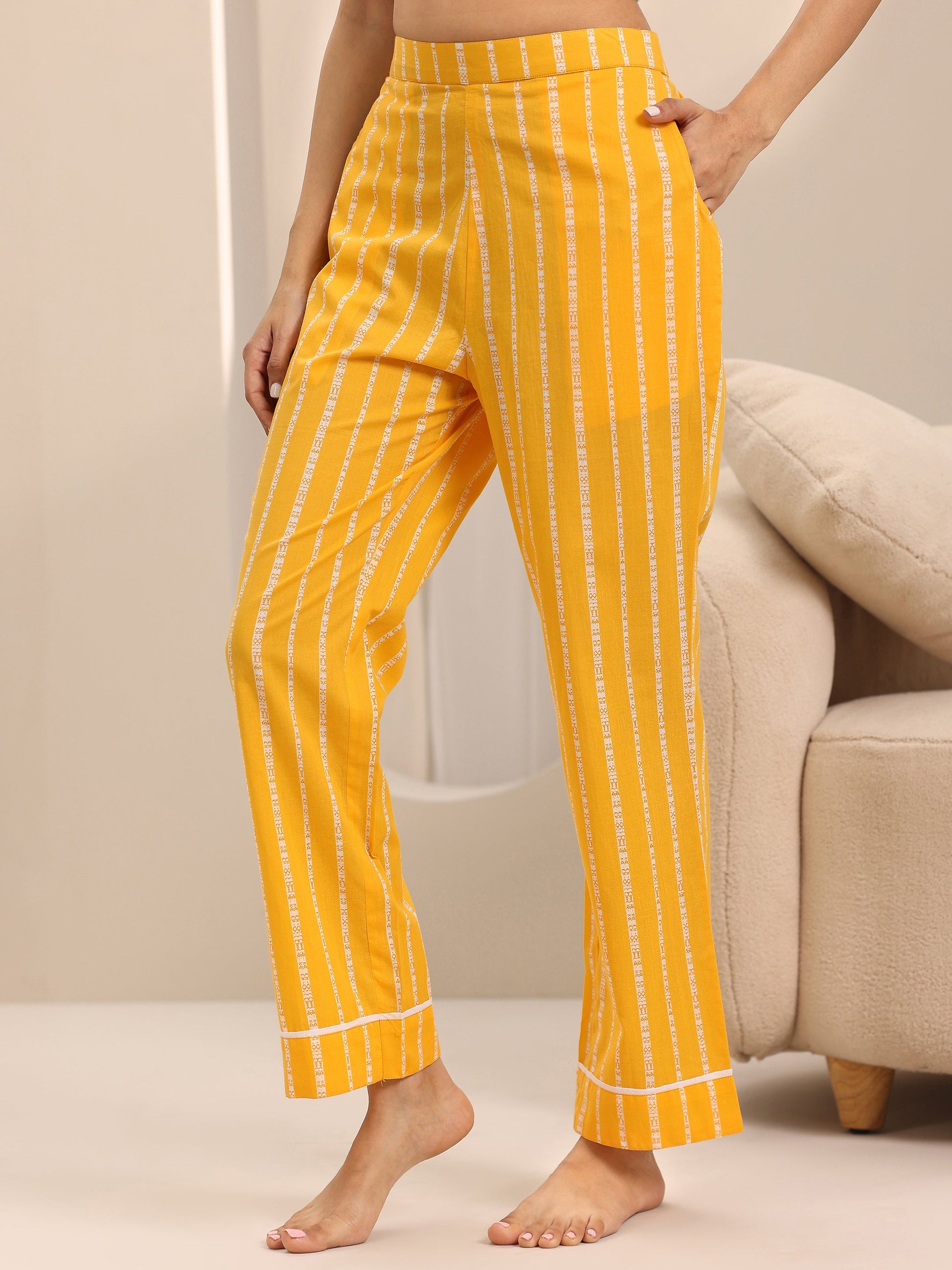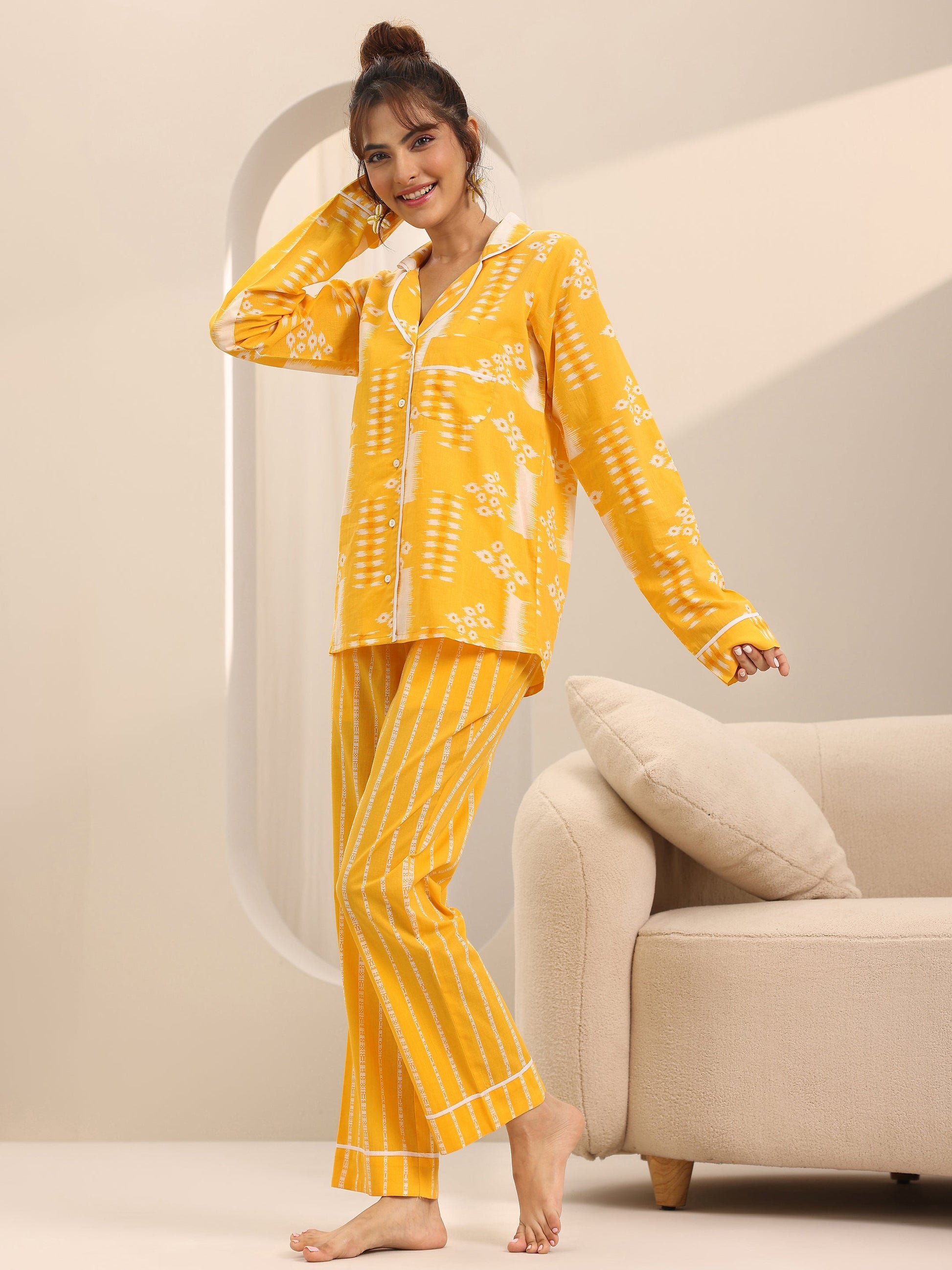 Our 2-piece Yellow printed Cotton nightsuit features a Shirt with a Shirt Collar neckline and Long Sleeves. Complemented with matching Pyjamas with an Elasticated waistband. Elevated with Printed embellishments, this style is perfect for Casual wear.