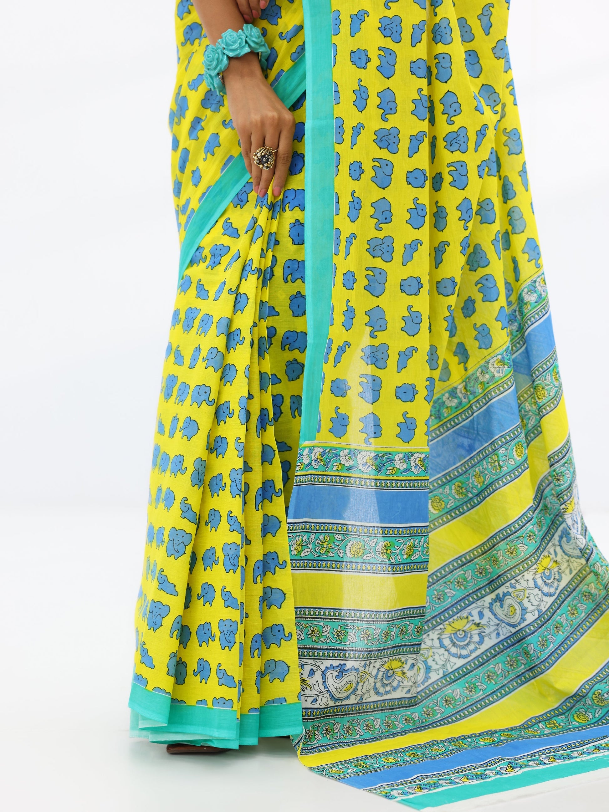 Our Yellow Printed Cotton Saree Features Captivating Animal Printed Design. Complemented With A Unstitched Blouse. This Charming Saree Is Perfect For Casual Wear