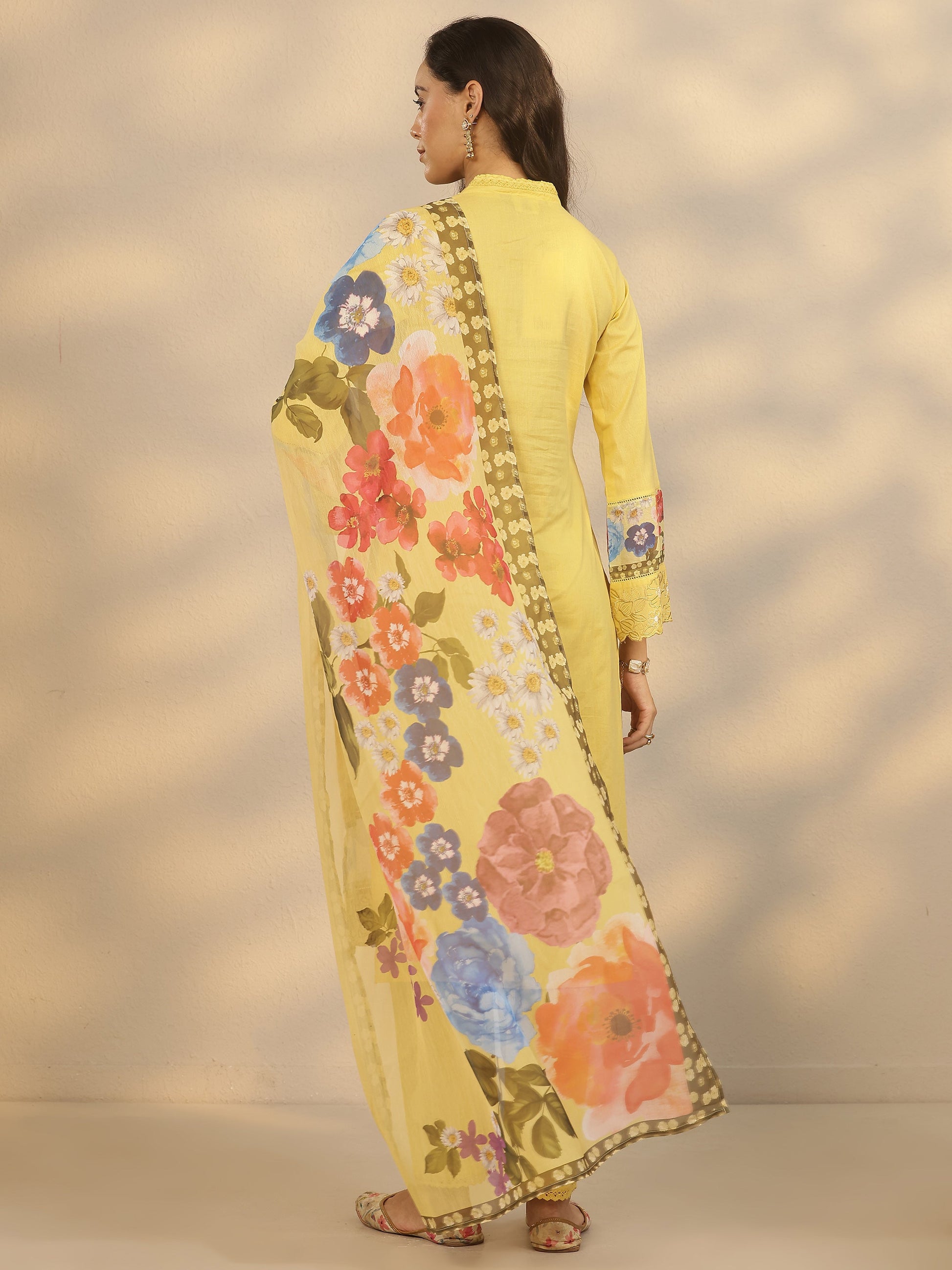 Yellow Printed Cotton Straight Suit Set With Dupatta