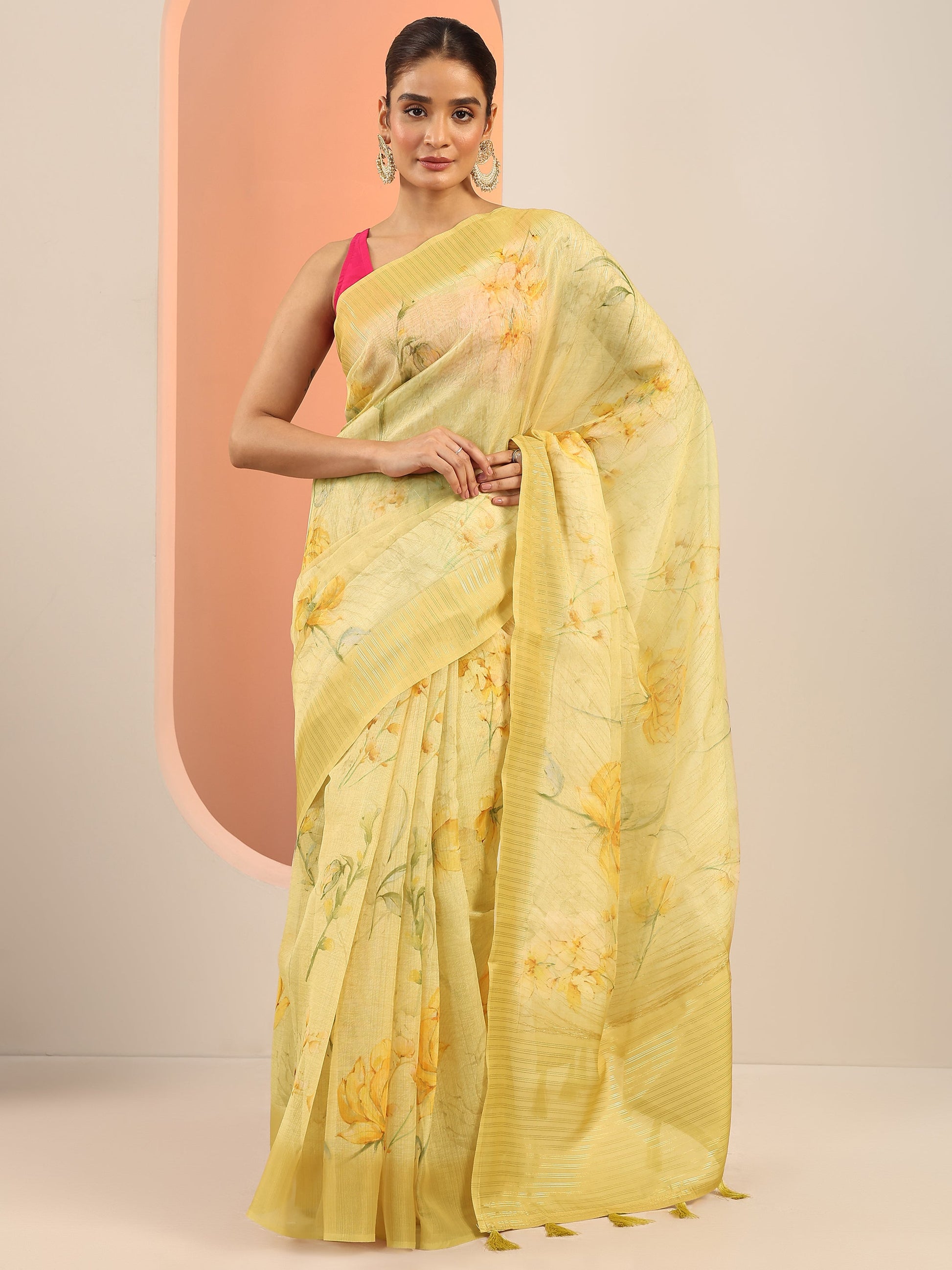 Yellow Printed Organza Saree With Unstitched Blouse Piece