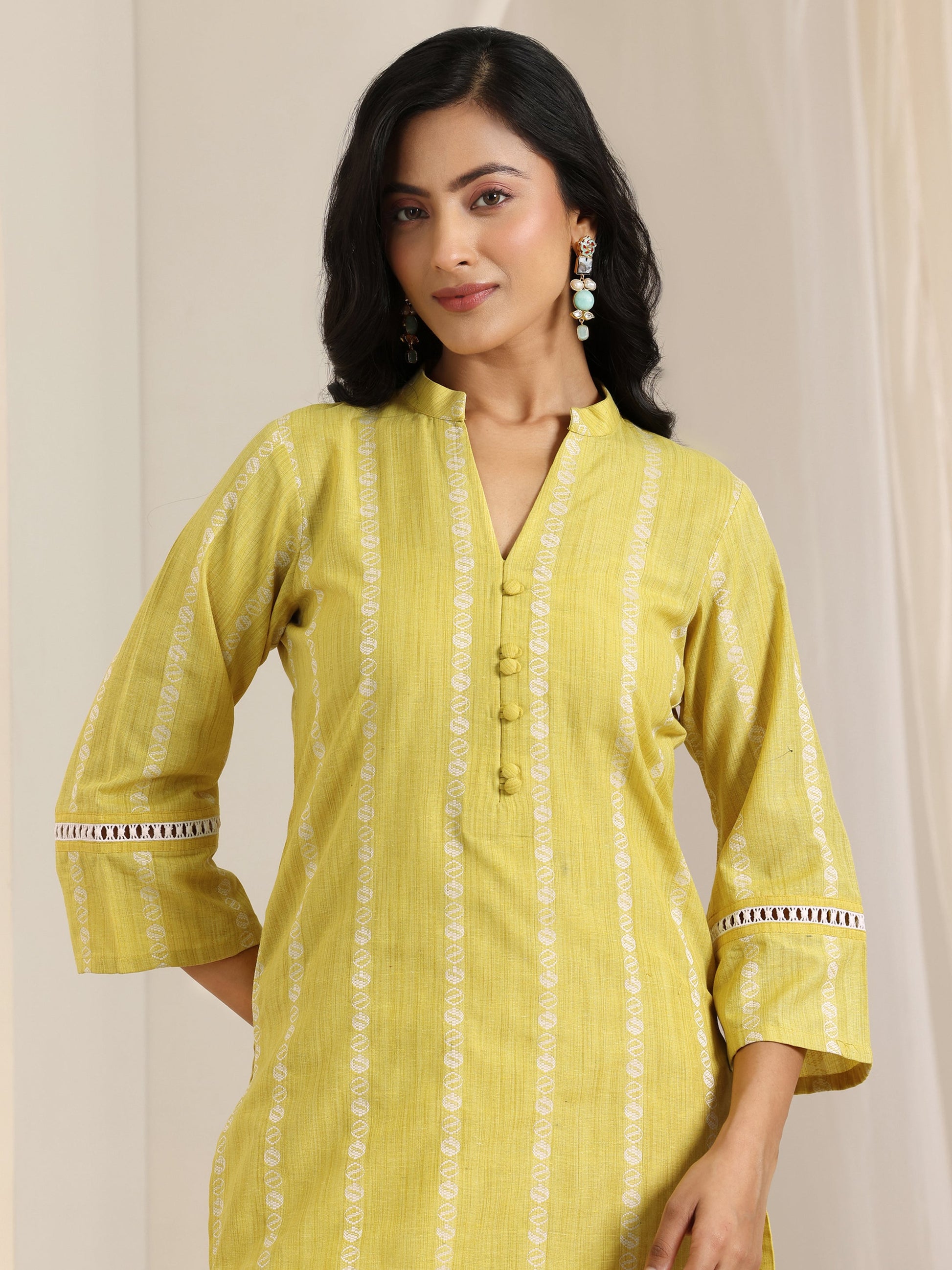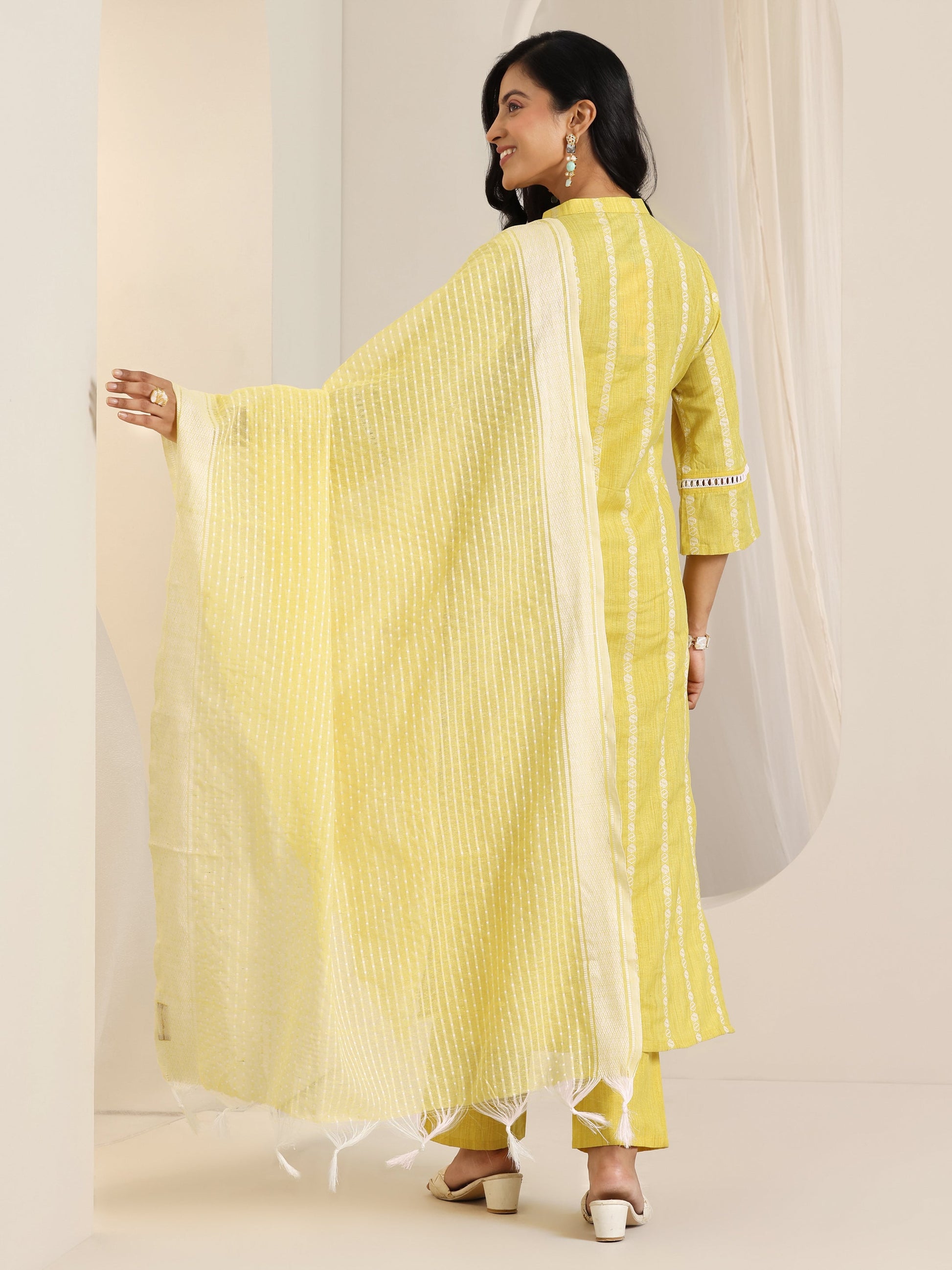 Our 3-piece Yellow Cotton Blend features a Straight-fit Kurta Set with a V-neckline, Regular Sleeves, and statement Yoke. Complemented with Straight Pants with an Elasticated waistband and a Striped dupatta. Adorned with Self Design, this style is perfect for Casual occasions.